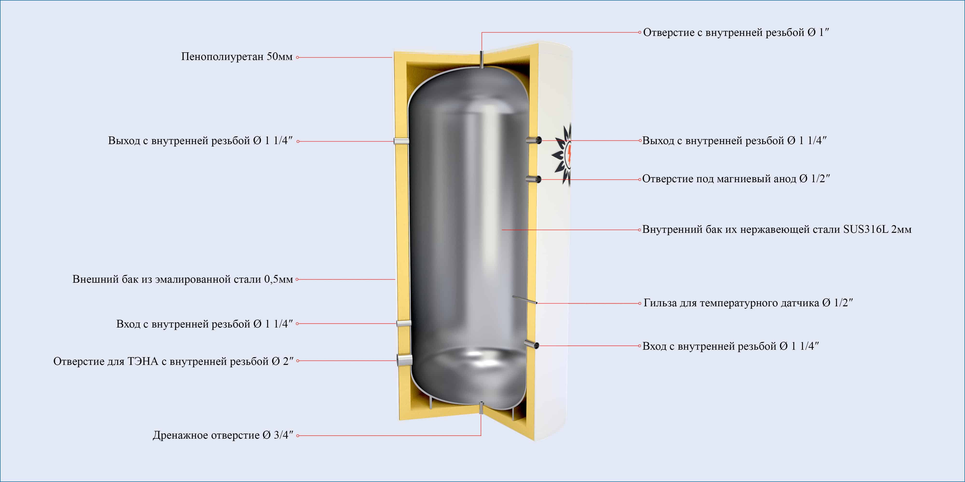 | Материал внешнего бака / толщина | Эмалированная сталь / 0,5 мм |