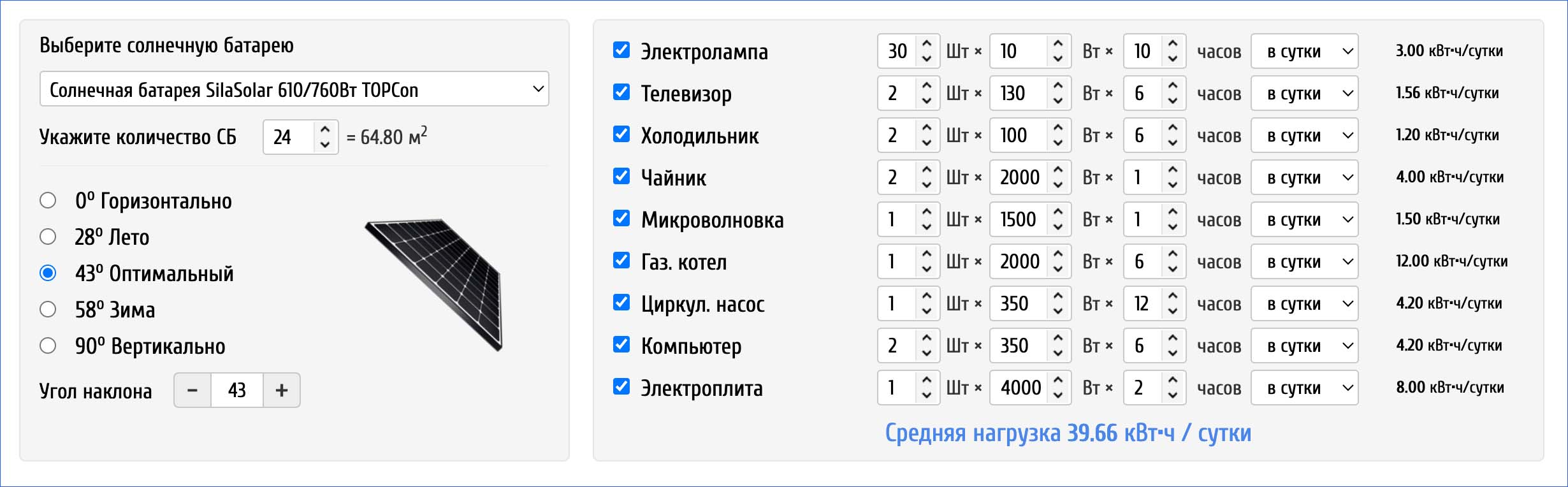 Примечание: Все расчеты являются примерными, для правильного и сбалансированного подбора систем автономного электроснабжения под Ваши нужды, необходимо обратиться к менеджерам нашей компании или заполнить и отправить заявку на расчет солнечной электростанции.