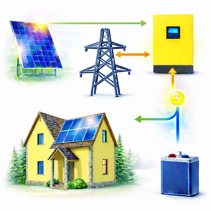 Функция подмешивания позволяет смешивать энергию от солнечных батарей с электроэнергией от центральной ( городской ) электро-сети, для питания нагрузки. К примеру ваше потребление в текущий момент времени 4кВт*ч, а солнечные батареи вырабатывают всего 3 кВт*ч, в этом случае инвертор с функцией подмешивания пустит на нагрузку все что вырабатывает солнце ( в данном примере это 3 квт*ч ), а недостающие 1 кВт*ч возьмет от центральной электро-сети, не разряжая АКБ и тем самым продлевая срок их службы. А обычный инвертор ( без функции подмешивания ) в такой же ситуации полностью переключит питание нагрузки ( все 4 кВт*ч ) либо на сеть либо на аккумуляторы ( в зависимости от настроек ), а вырабатываемые солнцем 3 кВт*ч пустит на подзарядку АКБ.