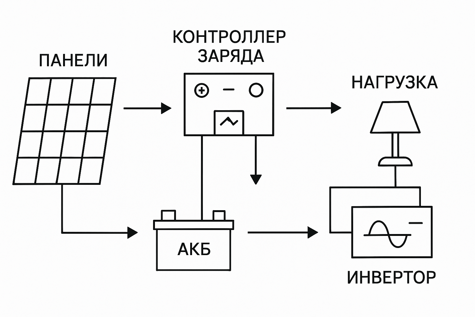 контроллер заряда → АКБ → инвертор → нагрузка