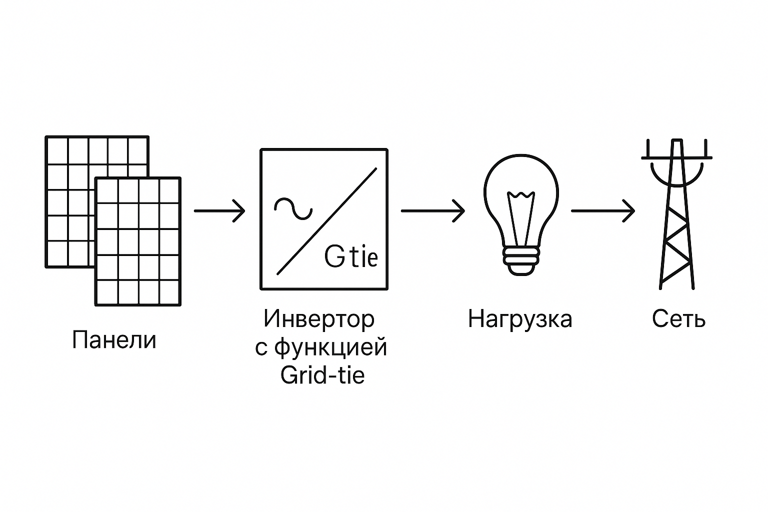2. Панели → сетевой инвертор (Grid-tie) → нагрузка + сеть